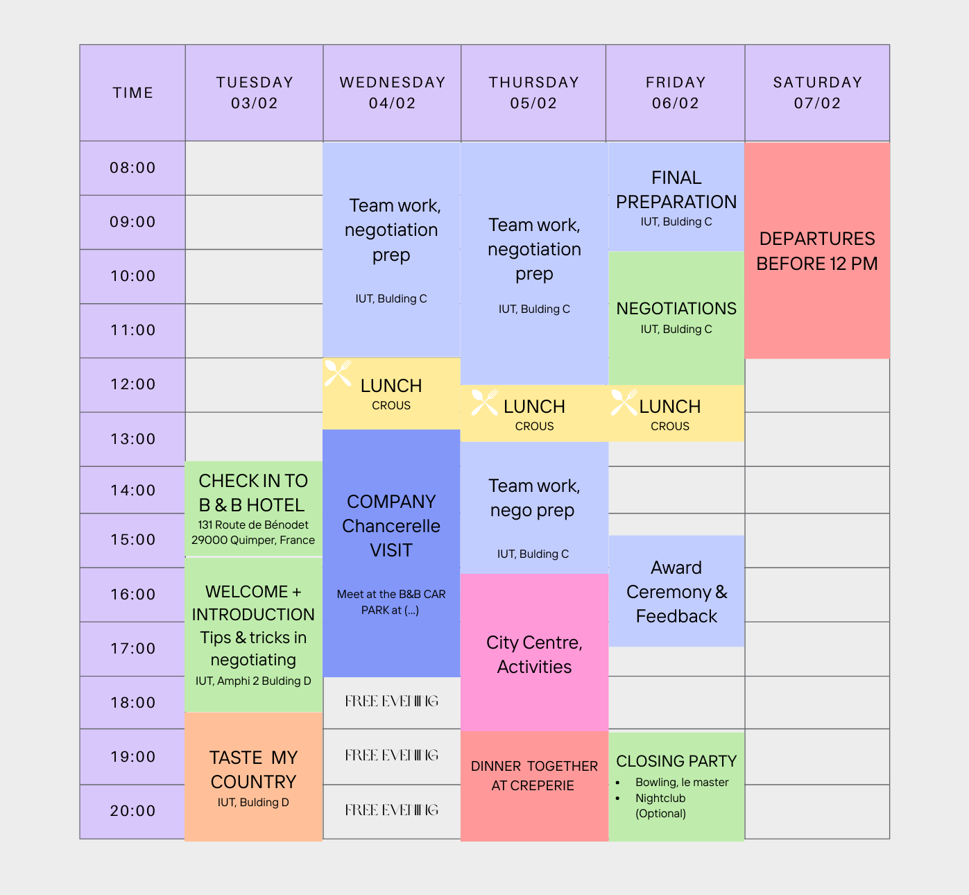 The final day of the week will be dedicated to a professional negotiation challenge focused on a Breton product. Students will work in teams to demonstrate their negotiation, communication, and teamwork skills. The best performances will be rewarded, highlighting creativity, strategy, and professionalism.